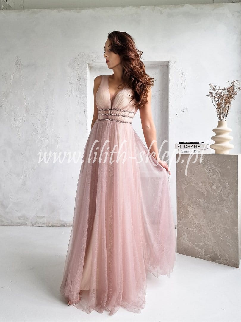 Rose -sukienka tiulowa z perełkami w talii, beżowo-różowa
