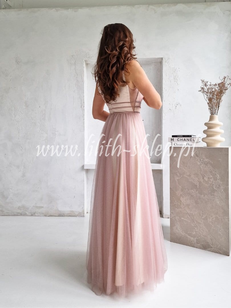 Długa suknia wieczorowa w beżowo-liliowym kolorze. Kreacja została posypana srebrnym brokatem, który przykuwa uwagę i nadaje niespotykanego wyglądu. Intrygujący prześwit wzdłuż dekoltu wspaniale eksponuje dekolt i piersi. Zdobiony pas na wysokości talii wysmukla sylwetkę, podkreślając ultra kobiece kształty. Rozkloszowany, tiulowy dół to komfort noszenia i efekt elegancji. Kreacja posiada wszyte wkładki, dzięki czemu można nosić ją bez dodatkowej bielizny. Zapinana z tyłu na suwak.