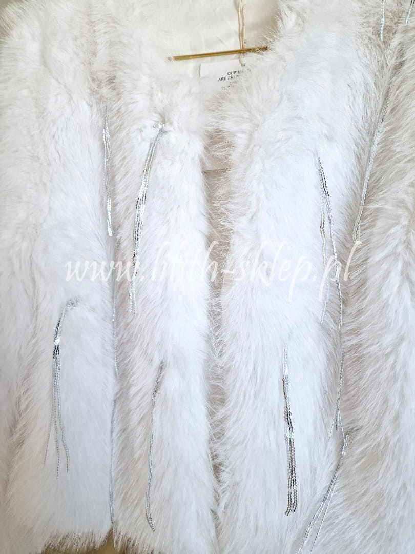 Elegancka narzutka o krótkim fasonie. Wykonana z przyjemnego w dotyku materiału- sztucznego futra. Model podszyty jest w całości gładką podszewką. Narzutka występuje w kolorze białym z doszytymi dodatkowo srebrnymi cekinami, które całości nadają wyjątkowego charakteru. Narzutka będzie doskonałym uzupełnieniem wieczorowej stylizacji.