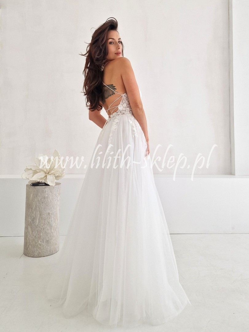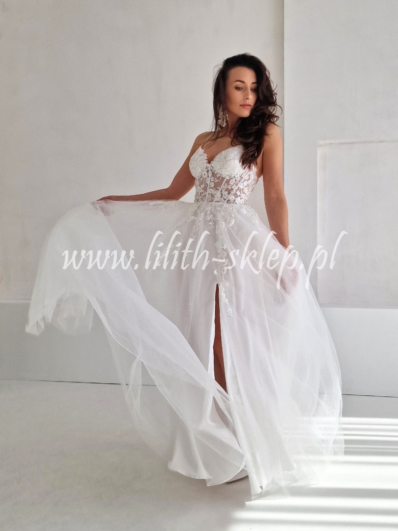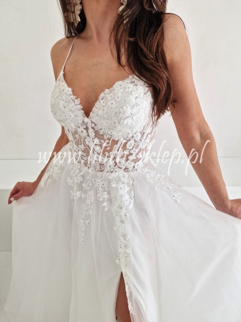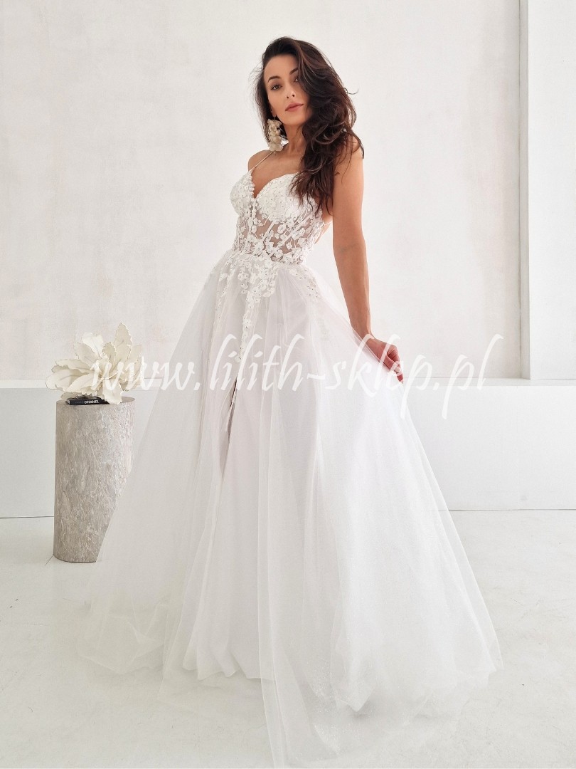 Blanche to wyjątkowa biała sukienka ślubna, która łączy lekkość tiulu z eleganckim, kobiecym krojem. Gorsetowa góra pięknie podkreśla sylwetkę, a odkryte plecy i wysokie rozcięcie na nodze dodają całości zmysłowego charakteru. Delikatny brokat subtelnie mieni się w świetle, tworząc efekt glamour idealny na ten wyjątkowy dzień.