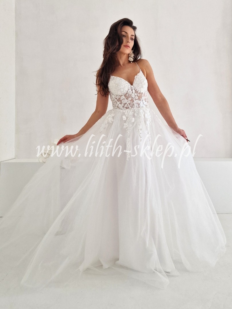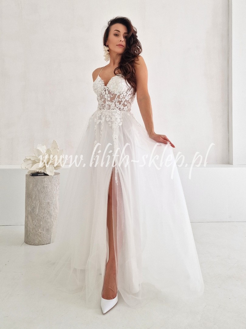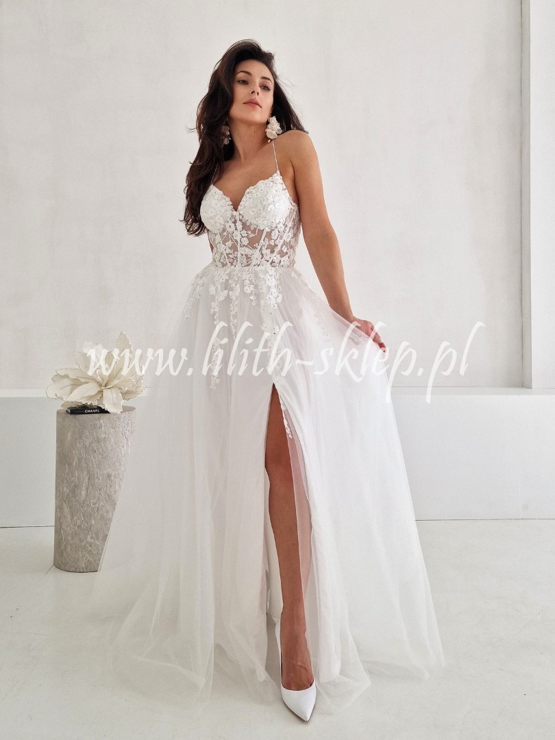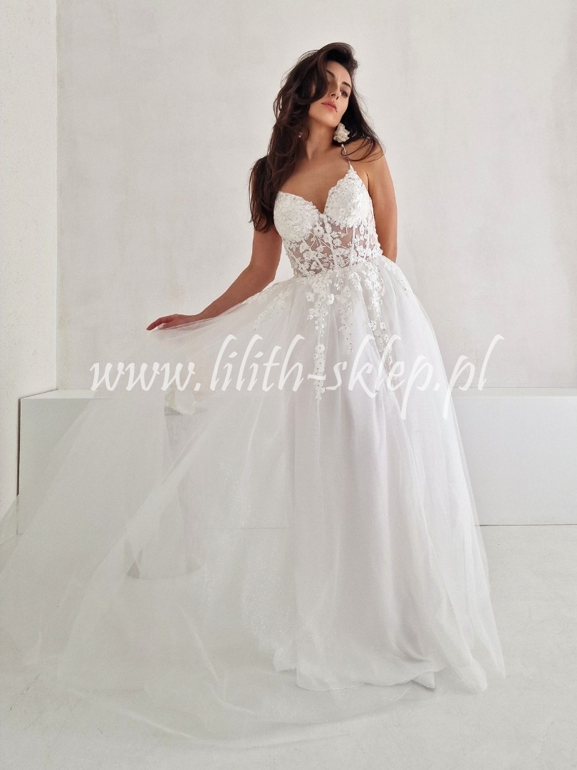 Blanche to wyjątkowa biała sukienka ślubna, która łączy lekkość tiulu z eleganckim, kobiecym krojem. Gorsetowa góra pięknie podkreśla sylwetkę, a odkryte plecy i wysokie rozcięcie na nodze dodają całości zmysłowego charakteru. Delikatny brokat subtelnie mieni się w świetle, tworząc efekt glamour idealny na ten wyjątkowy dzień.