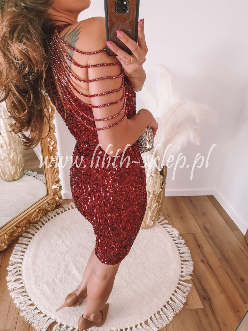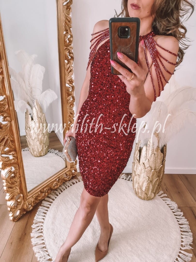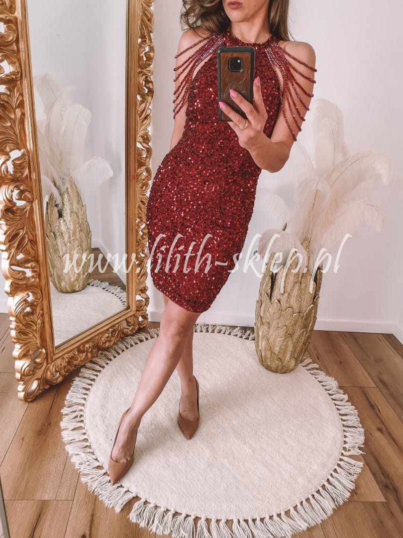 Veer -cekinowa mini z koralikami na ramionach, bordowa