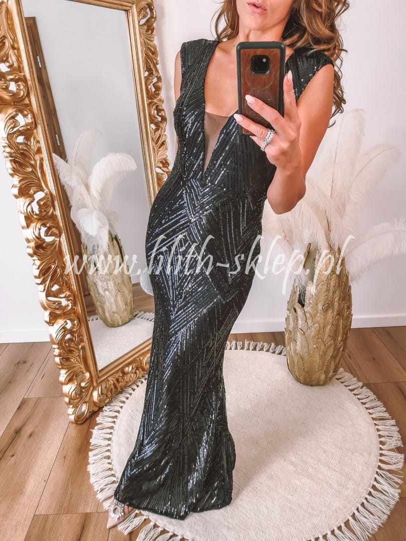 Wieczorowa sukienka maxi o kroju syrenki posypana cekinami. Kreacja występuje w klasycznej czerni. Sukienka posiada efektowne wycięcie na plecach przyozdobione koralikami. Góra dopasowana, na szerokich ramiączkach. Intrygujący prześwit wzdłuż dekoltu nadaje sukience niepowtarzalnego charakteru. Dół ołówkowy, delikatnie rozszerzający się na dole. Elastyczny materiał zapewnia idealne dopasowanie do sylwetki. Kreacja posiada wszyte wkładki, dzięki czemu można nosić ją bez dodatkowej bielizny. Zapinana z tyłu na kryty zamek.