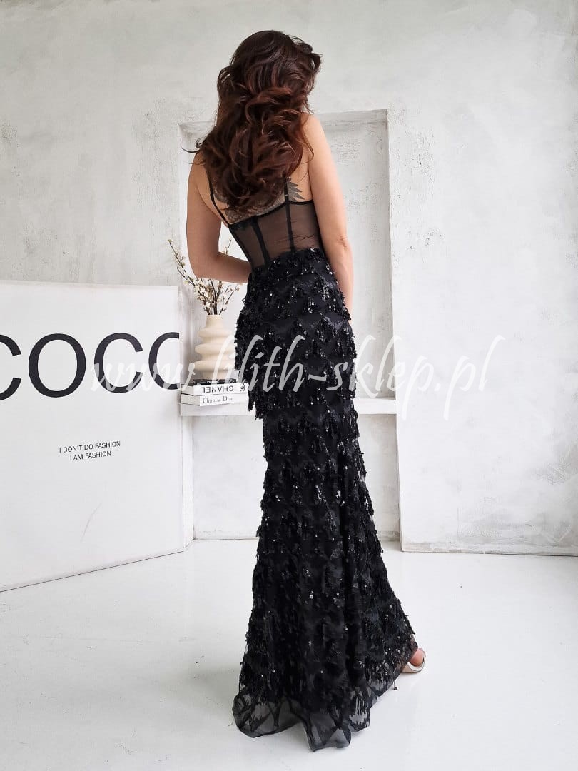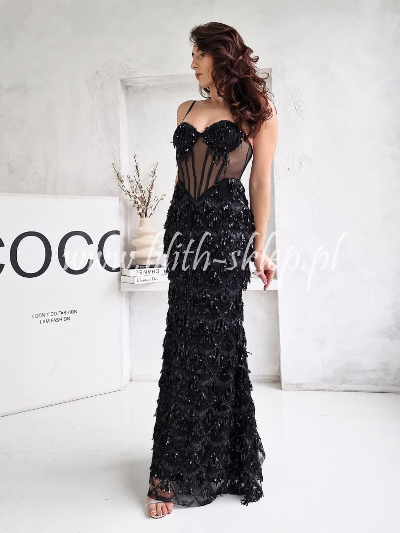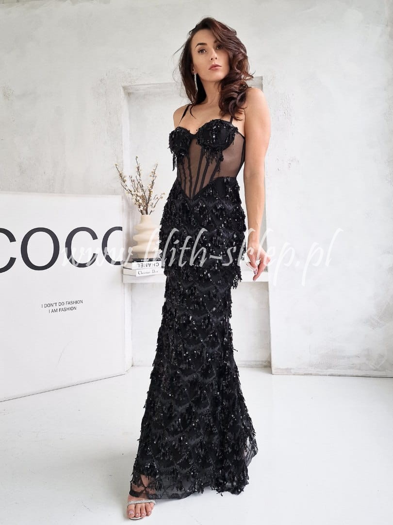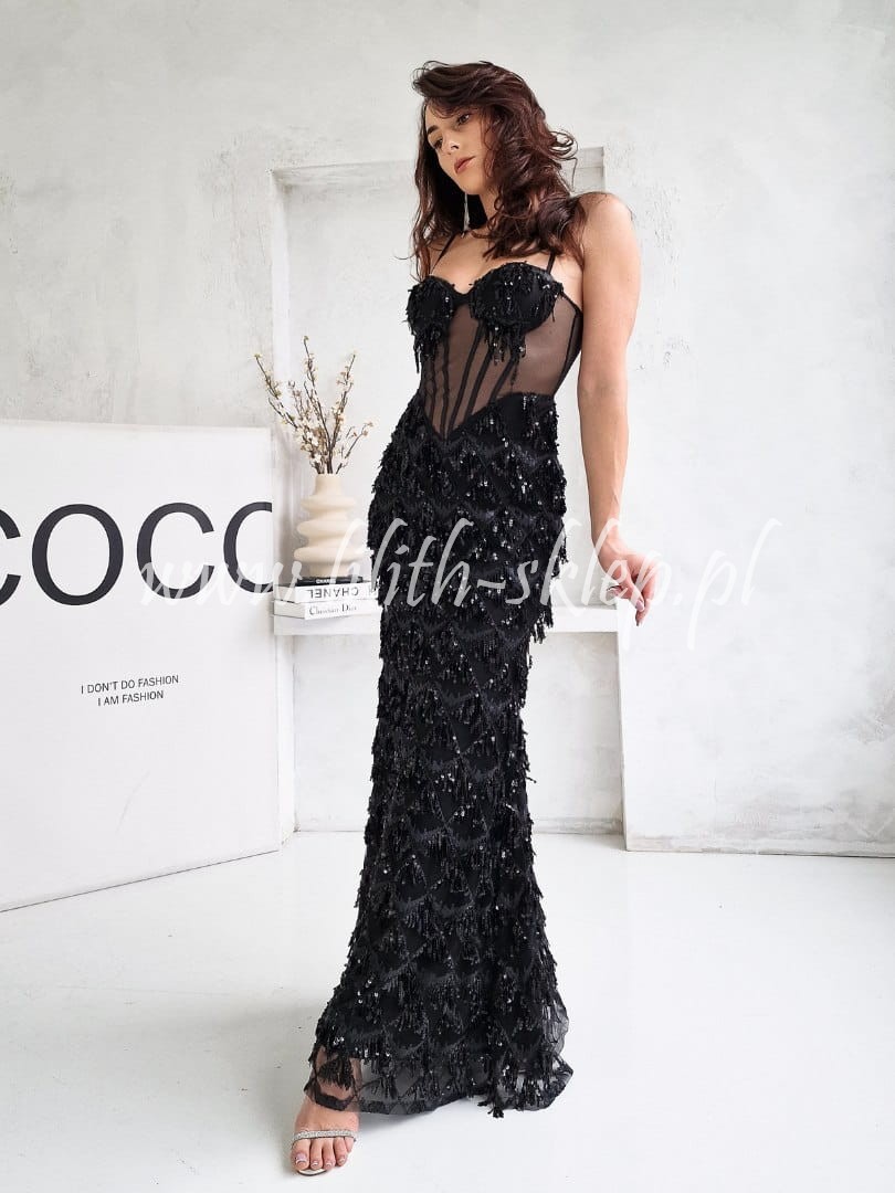 Zara -czarna sukienka gorsetowa z frędzlami