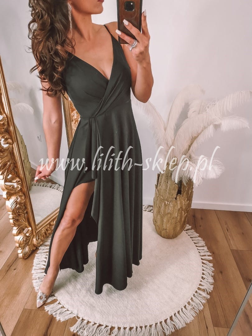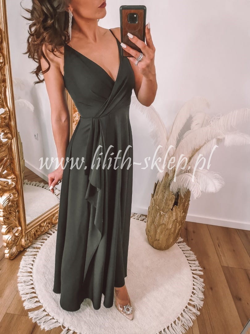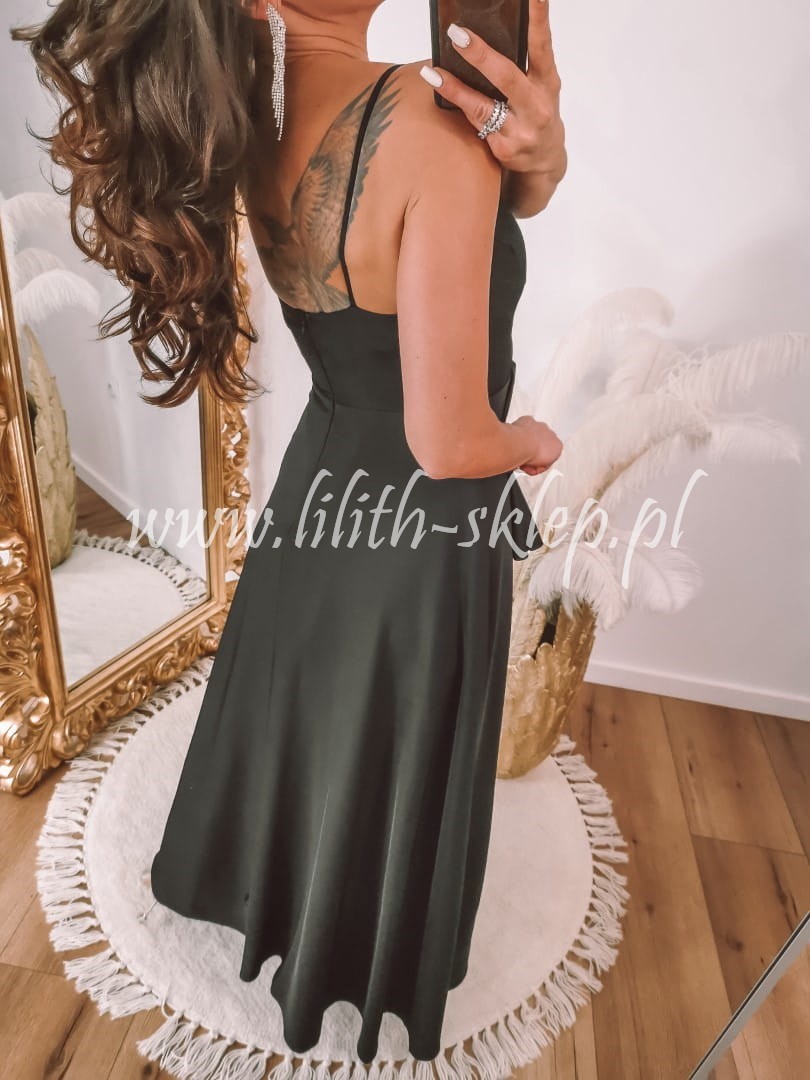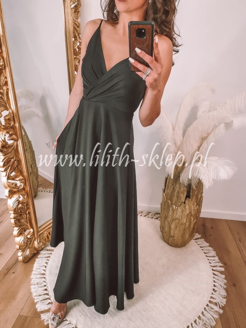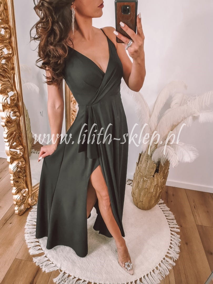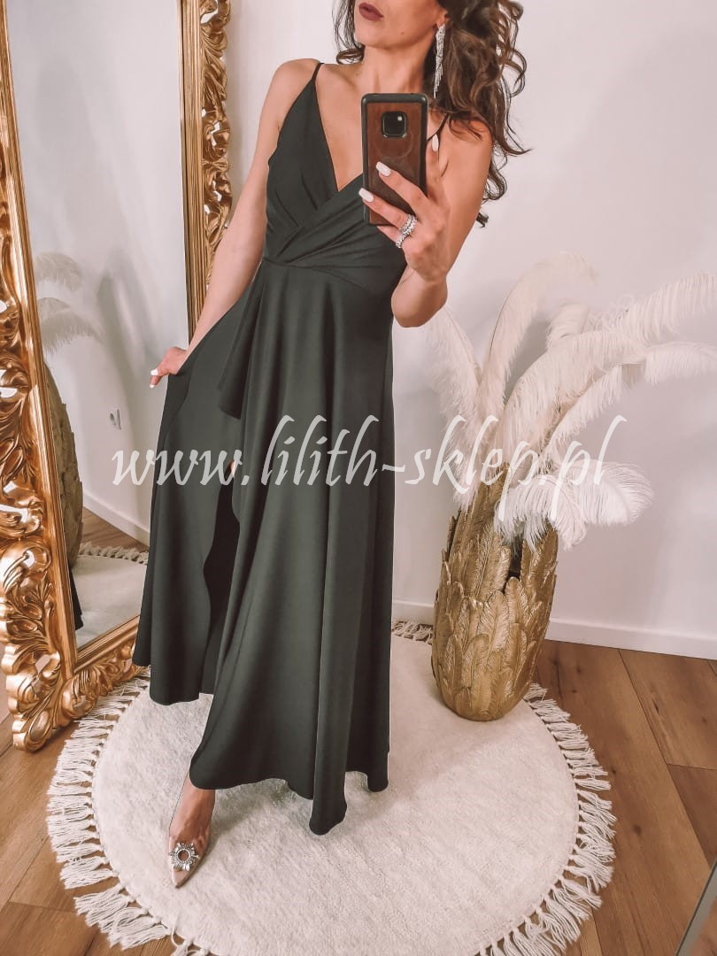 Sukienka maxi na cienkich ramiączkach z kopertowym dekoltem, który przepięknie eksponuje biust. Góra sukienka dopasowana, idealnie przylegająca do ciała. Dół z efektownym rozcięciem eksponującym nogi. Z tyły zapięcie na suwak. Sukienka występuje w klasycznej czerni.
