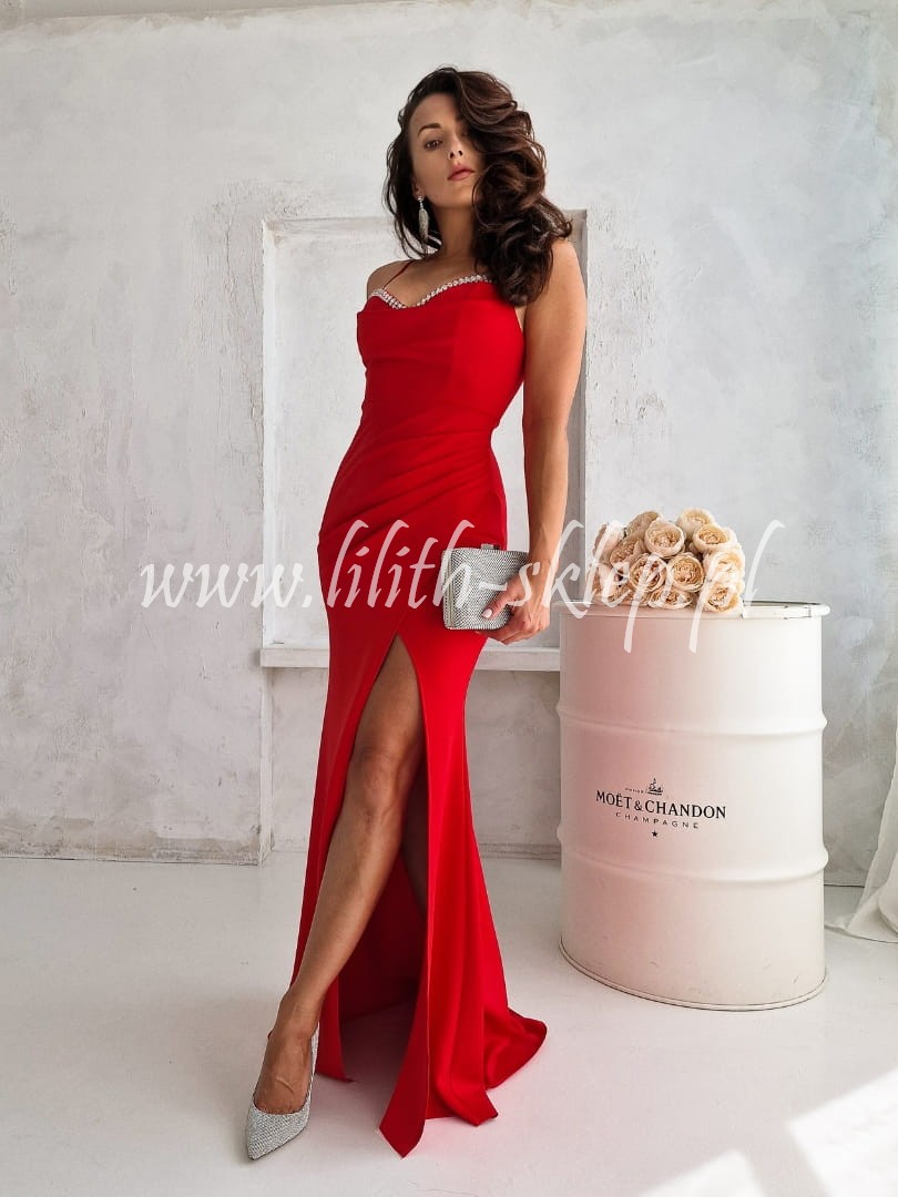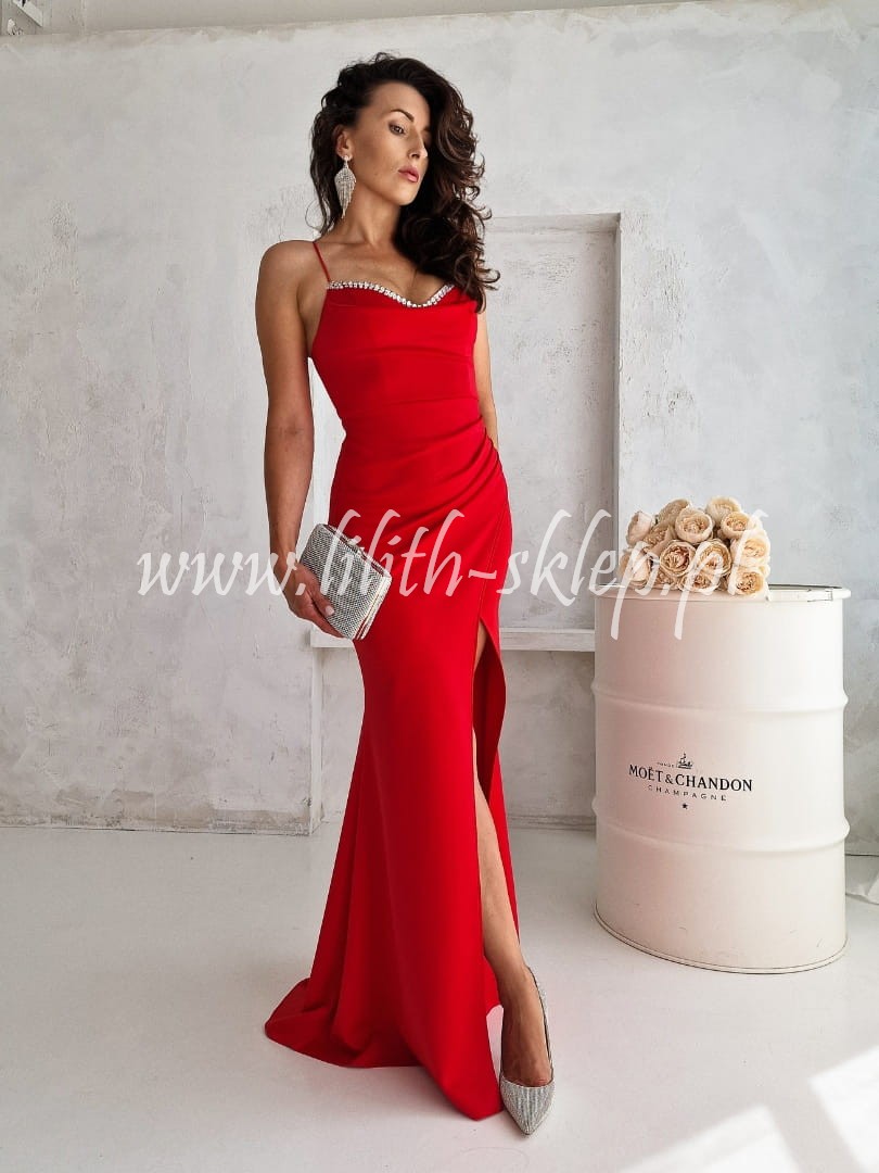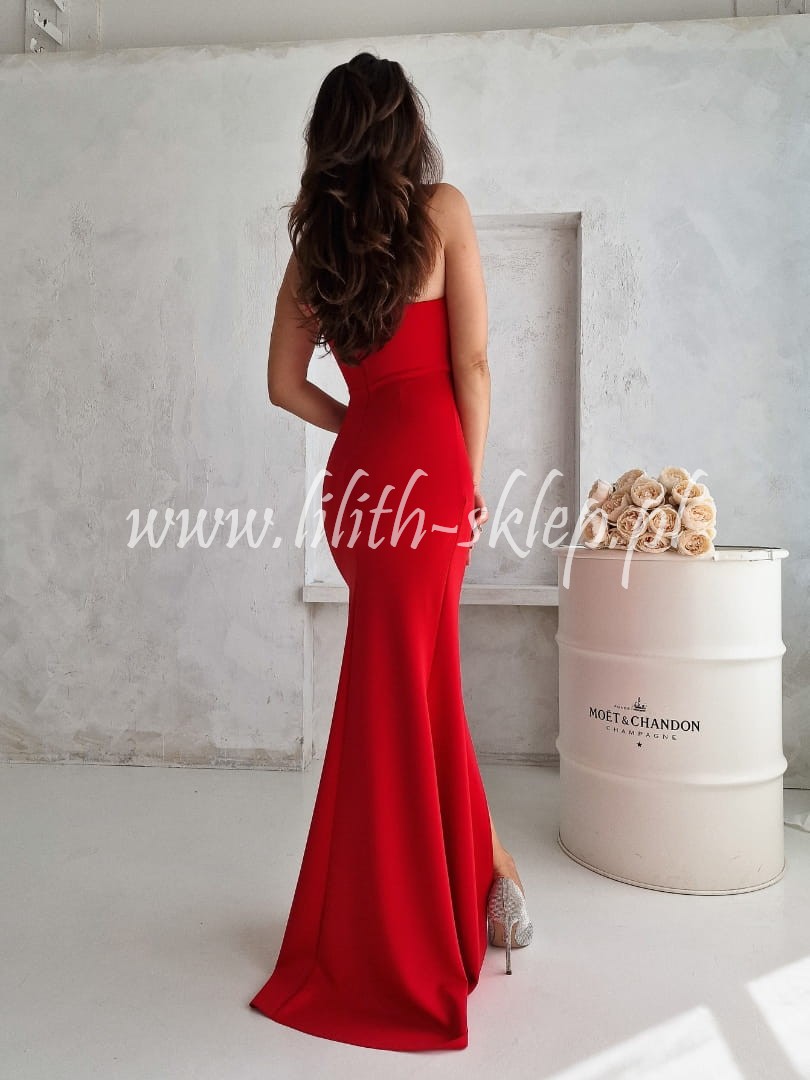 Daphne -czerwona dopasowana sukienka z rozcięciem i ozdobną górą