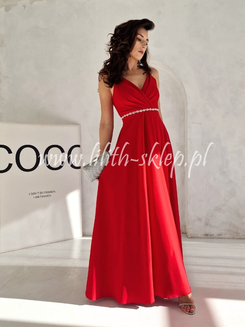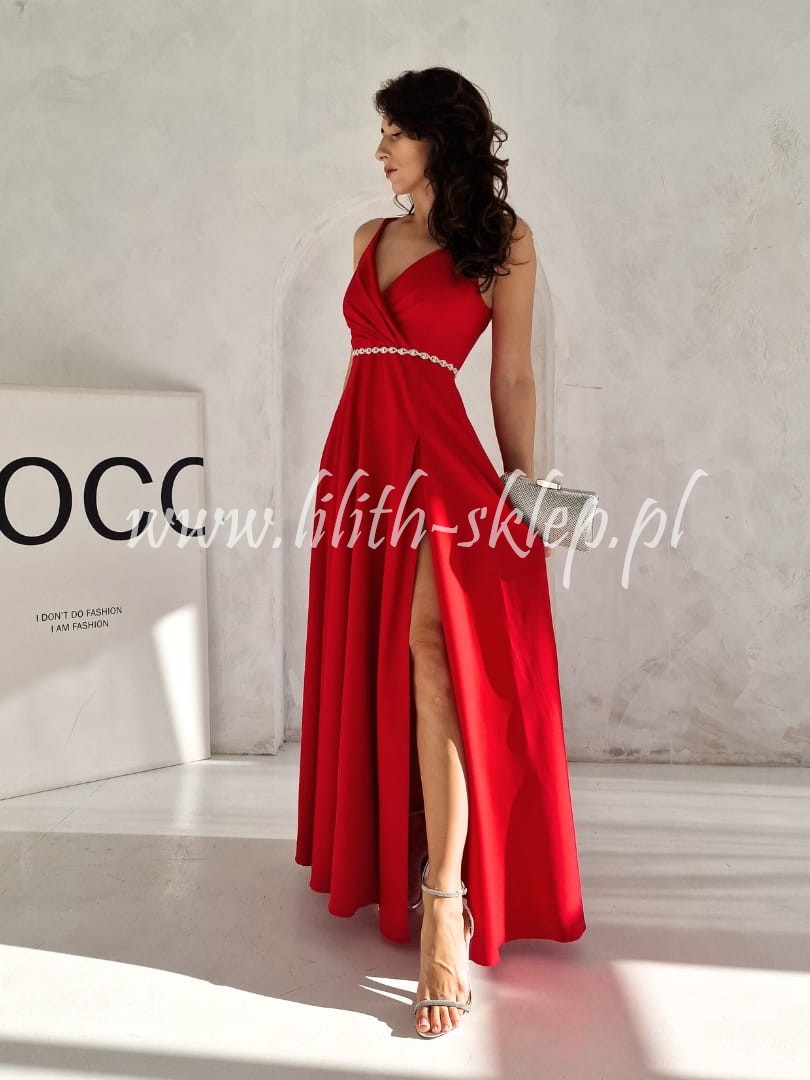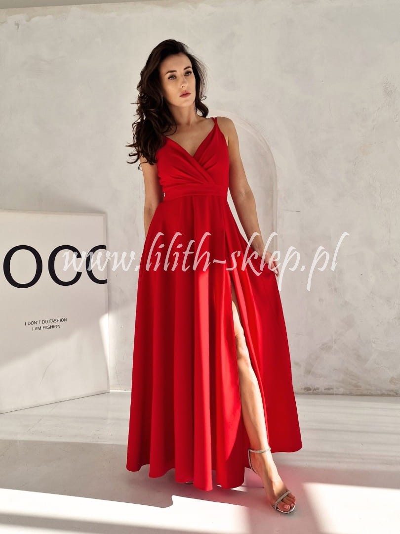 Sukienka maxi na cienkich ramiączkach z kopertowym dekoltem, który przepięknie eksponuje biust. Góra sukienka dopasowana, idealnie przylegająca do ciała. Dół z efektownym rozcięciem eksponującym nogi. Sukienka została ozdobiona paskiem na wysokości talii. Dzięki czemu wysmukla sylwetkę, podkreślając ultra kobiece kształty. Z tyły zapięcie na suwak. Sukienka występuje w soczystej czerwieni.