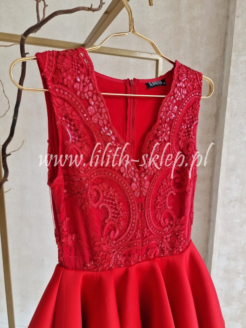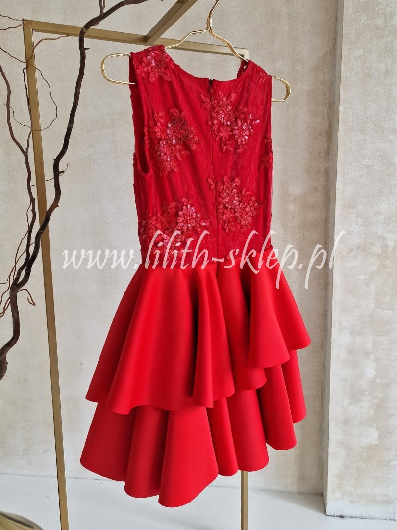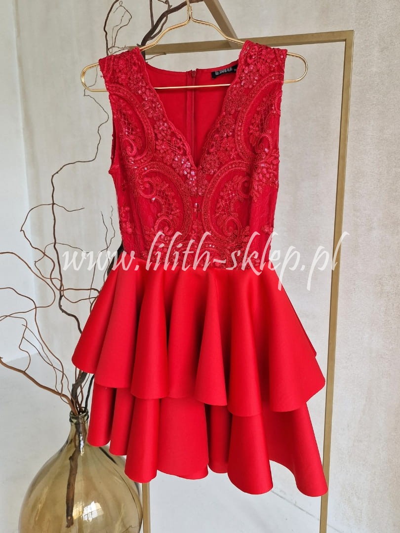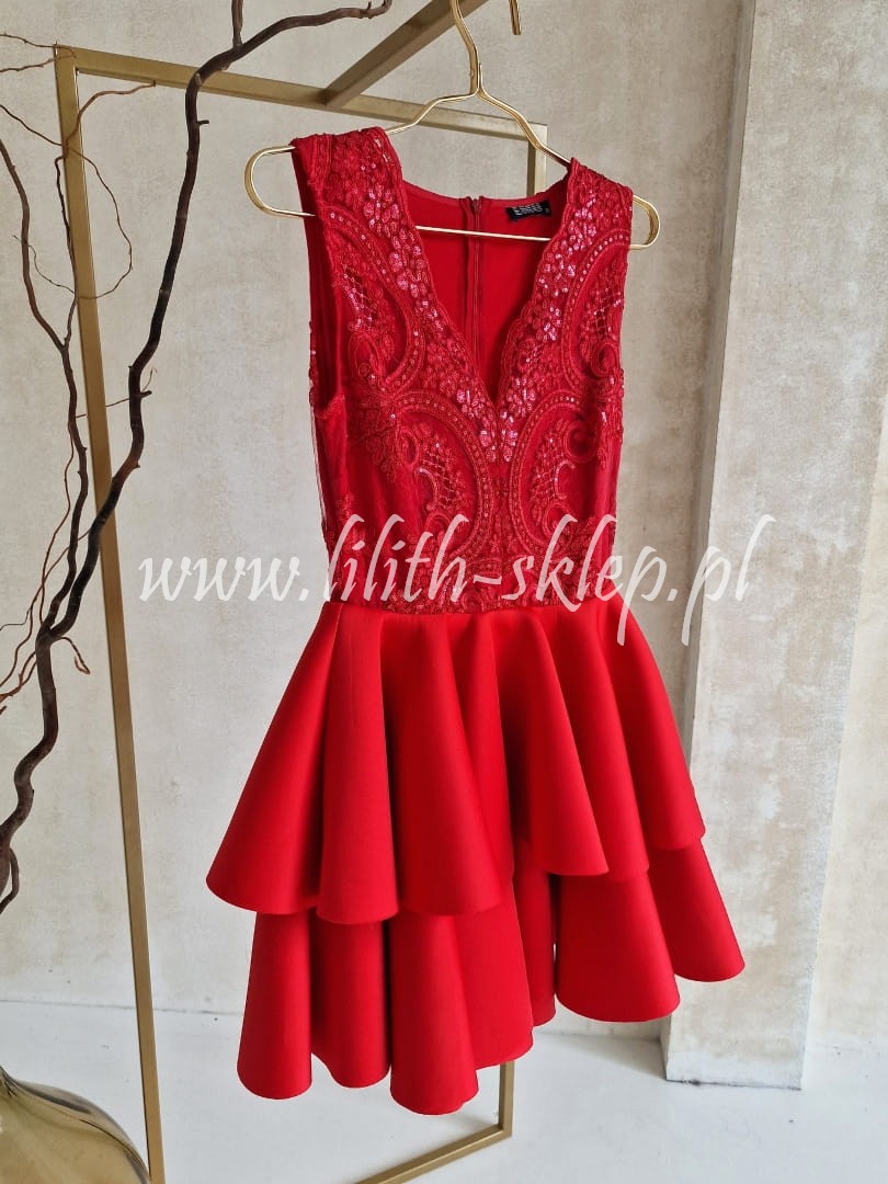 Zniewalająca krótka sukienka z falbanami. Kreacja występuje w czerwonym kolorze.