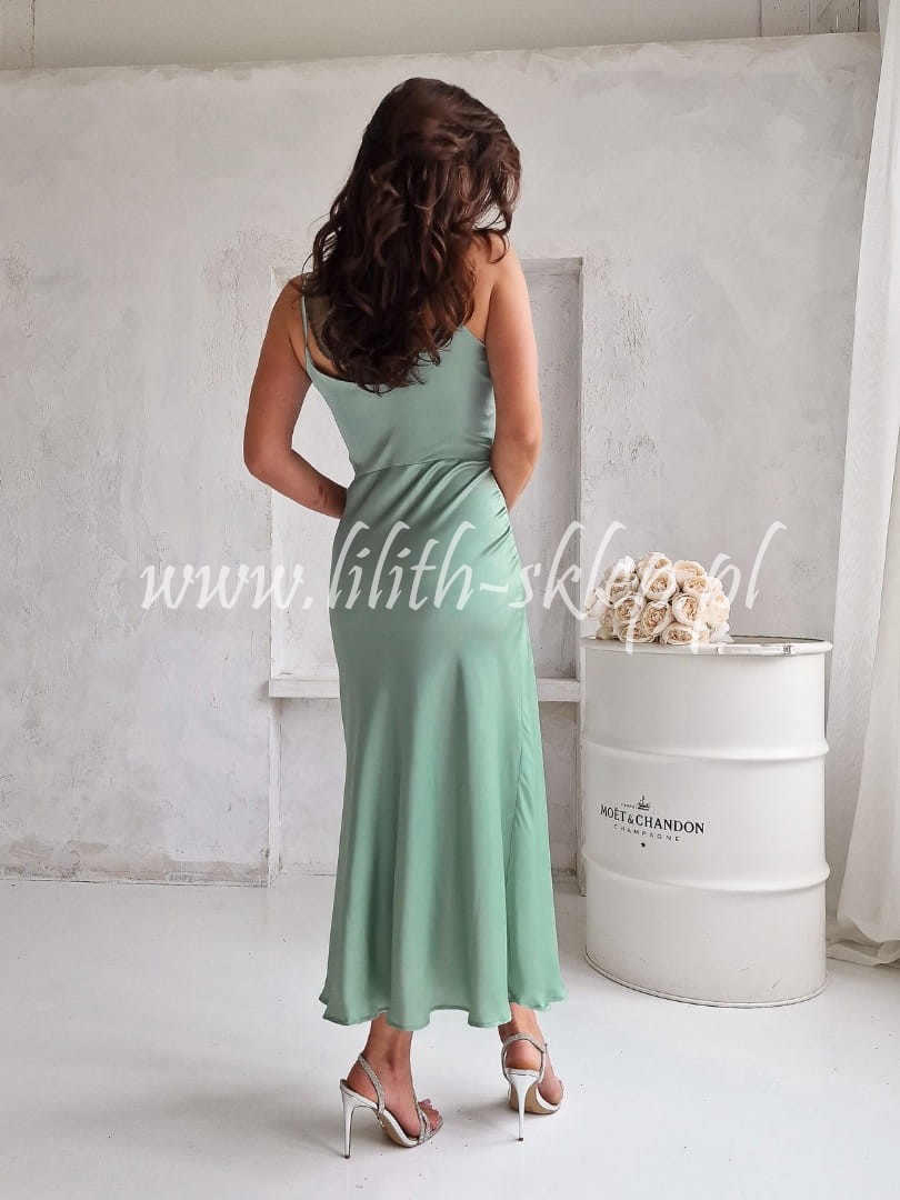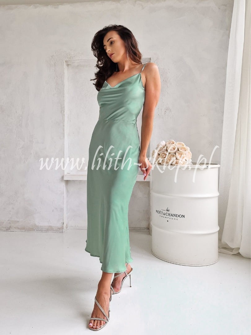 Fabia - prosta sukienka satynowa na cienkich ramiączkach pistacjowa