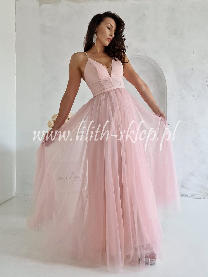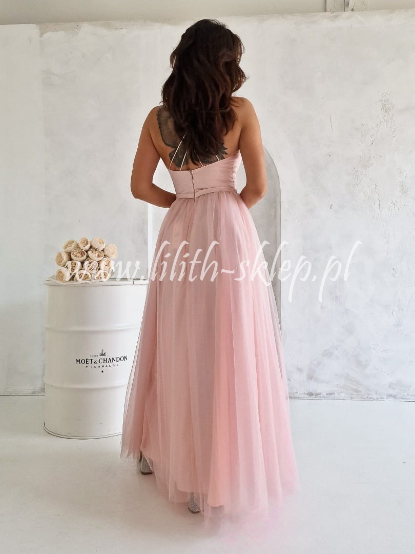 Olśniewająca suknia balowa w stylu księżniczki, której obszerna spódnica oraz zmysłowo powycinana góra zapewnią spektakularny efekt. Góra dopasowana na cienkich ramiączkach z długim dekoltem w szpic. Wierzch sukienki przyozdobiony srebrnym brokatem. Spód wykonany z podszewki w kolorze pudrowego różu. Kreacja posiada wszyte wkładki, dzięki czemu można nosić ją bez dodatkowej bielizny. Dół wykonany z romantycznego i lekkiego tiulu. Sukienka posiada rozcięcie seksownie ukazujące nogę. Zapinana z tyłu na suwak.