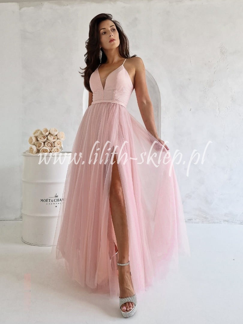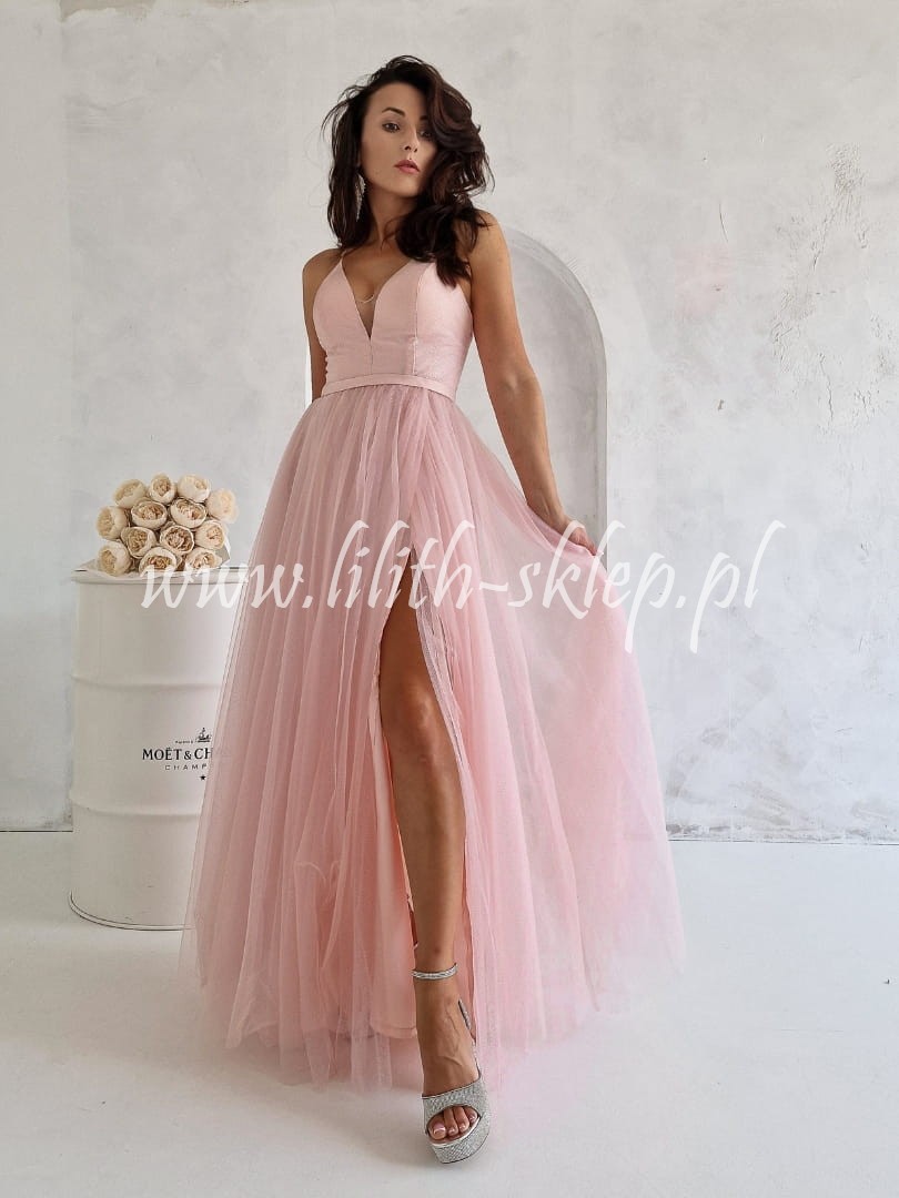 Ganna -różowa sukienka tiulowa z rozcięciem na nodze