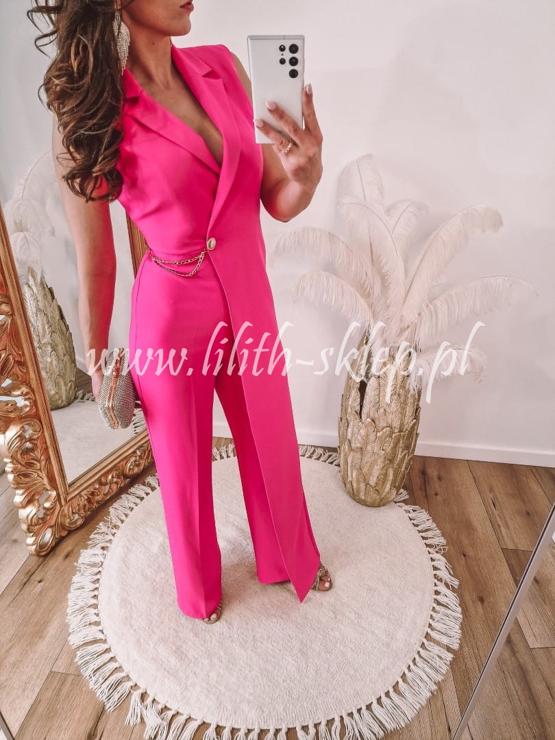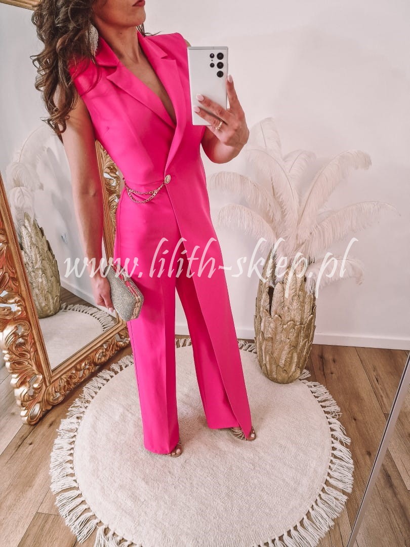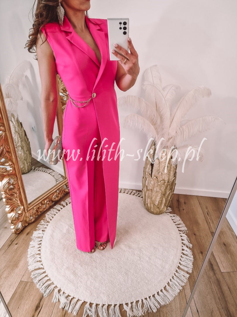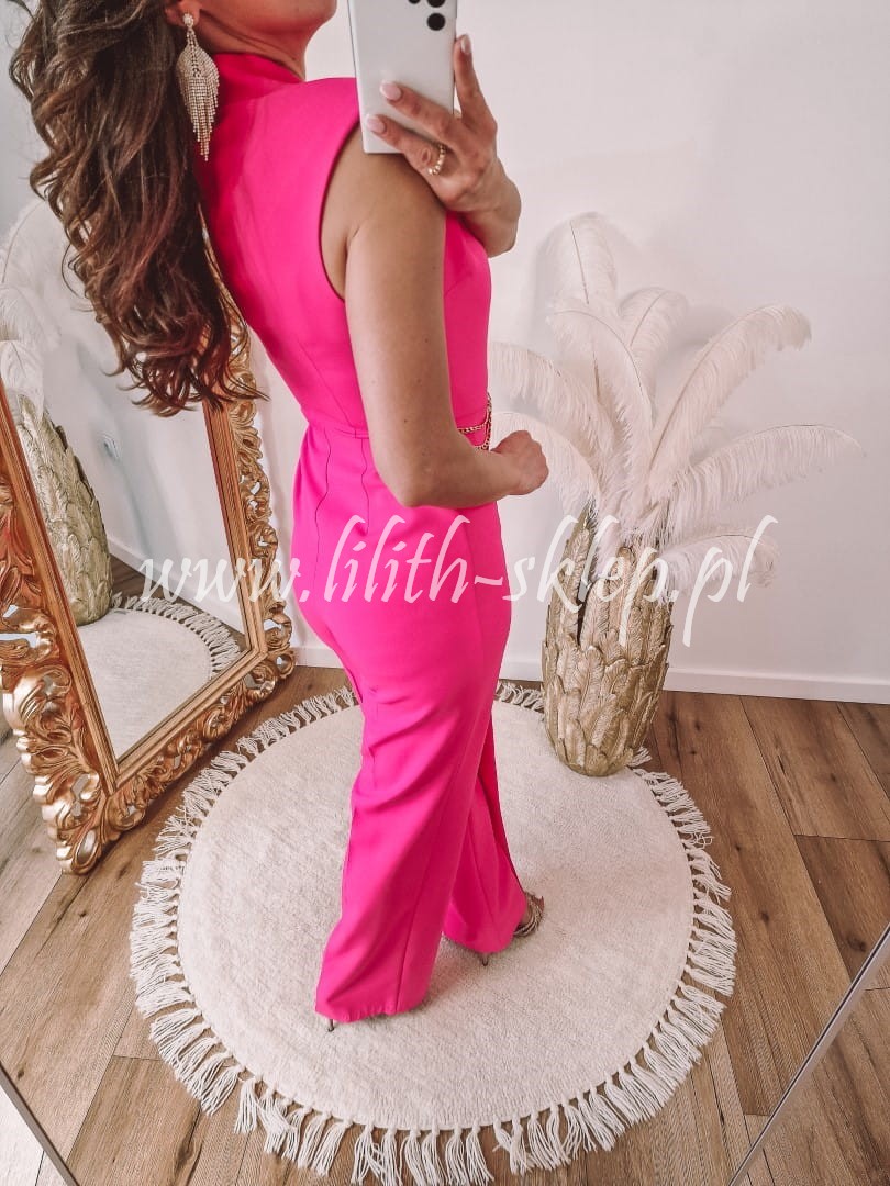 Wyjątkowy, niezwykle kobiecy kombinezon w kolorze jasnej fuksji. Zapinany z boku na suwak oraz ozdobny guzik. Model posiada proste nogawki i V-dekolt idealnie podkreślający biust. Kombinezon został przyozdobiony dodatkowym materiałem na jednym boku oraz złotym łańcuszkiem. Sprawdzi się on idealnie na wesele, chrzciny, komunię czy randkę. Gwarantujemy, że w tym modelu na pewno nie przejdziesz niezauważona!