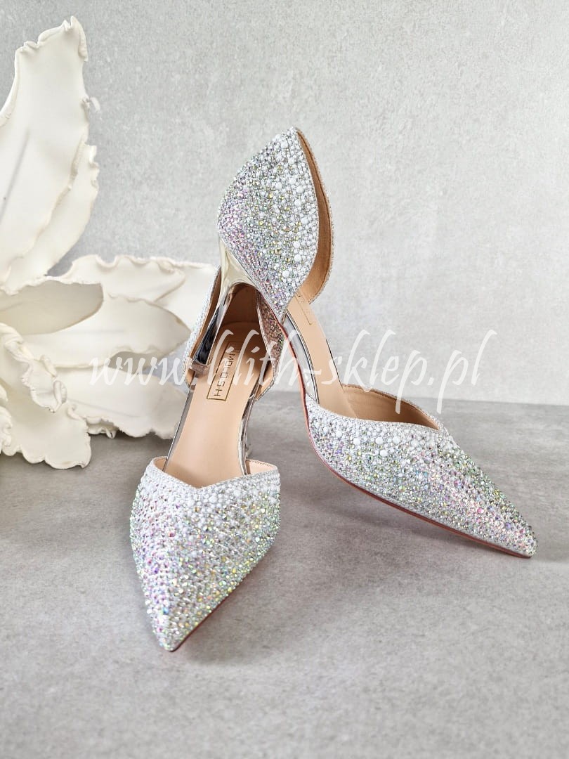 Zjawiskowe szpilki, które zachwycają swoim wyjątkowym designem i wygodą użytkowania. Asymetryczny model pokryty połyskującymi cyrkoniami. Miękka wkładka wykonana ze skóry ekologicznej. Stabilny obcas o kształcie szpilki, którego wysokość wynosi 8,5 cm dla rozmiaru 36.