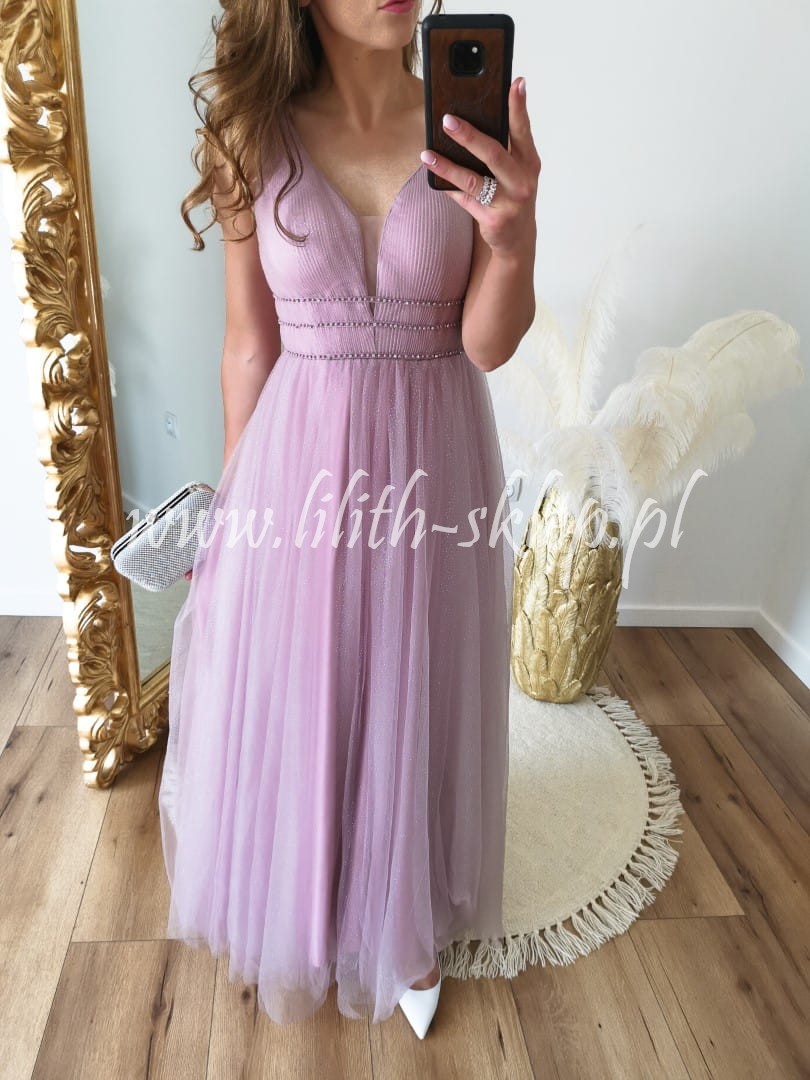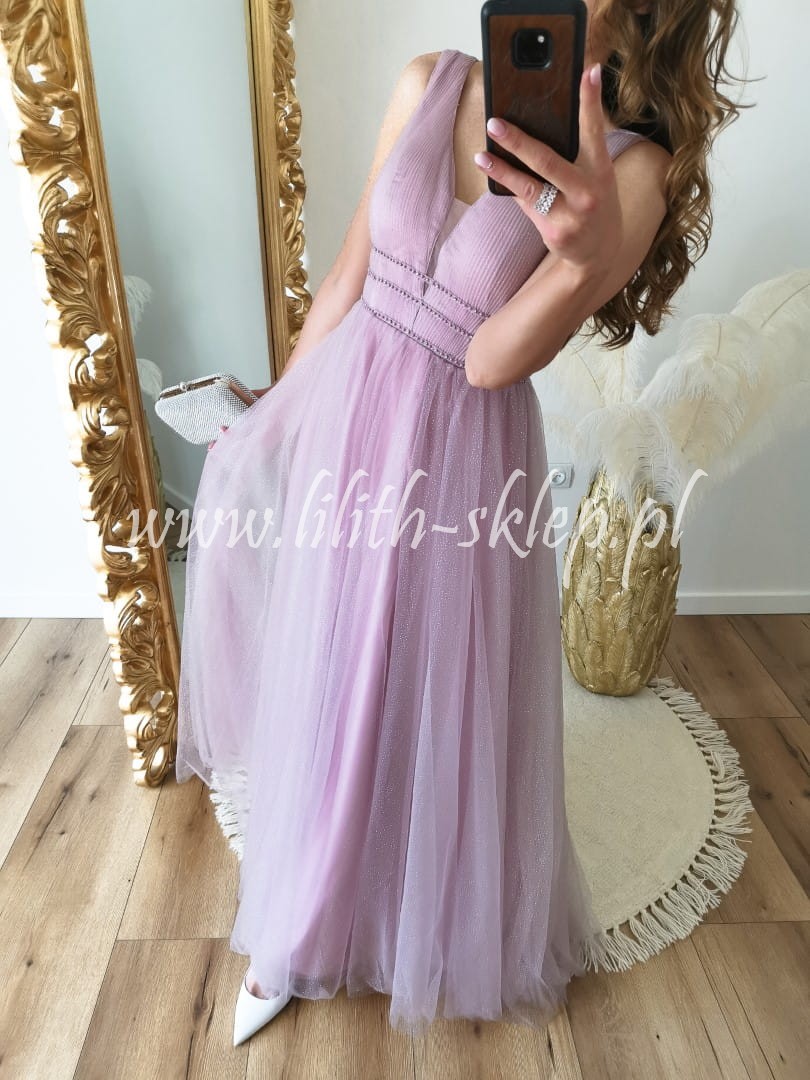 Tiulowa sukienka maxi z perełkami w talii, wrzosowa