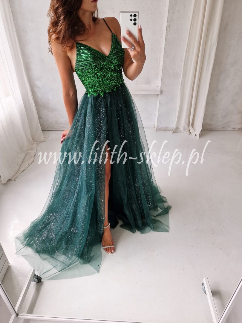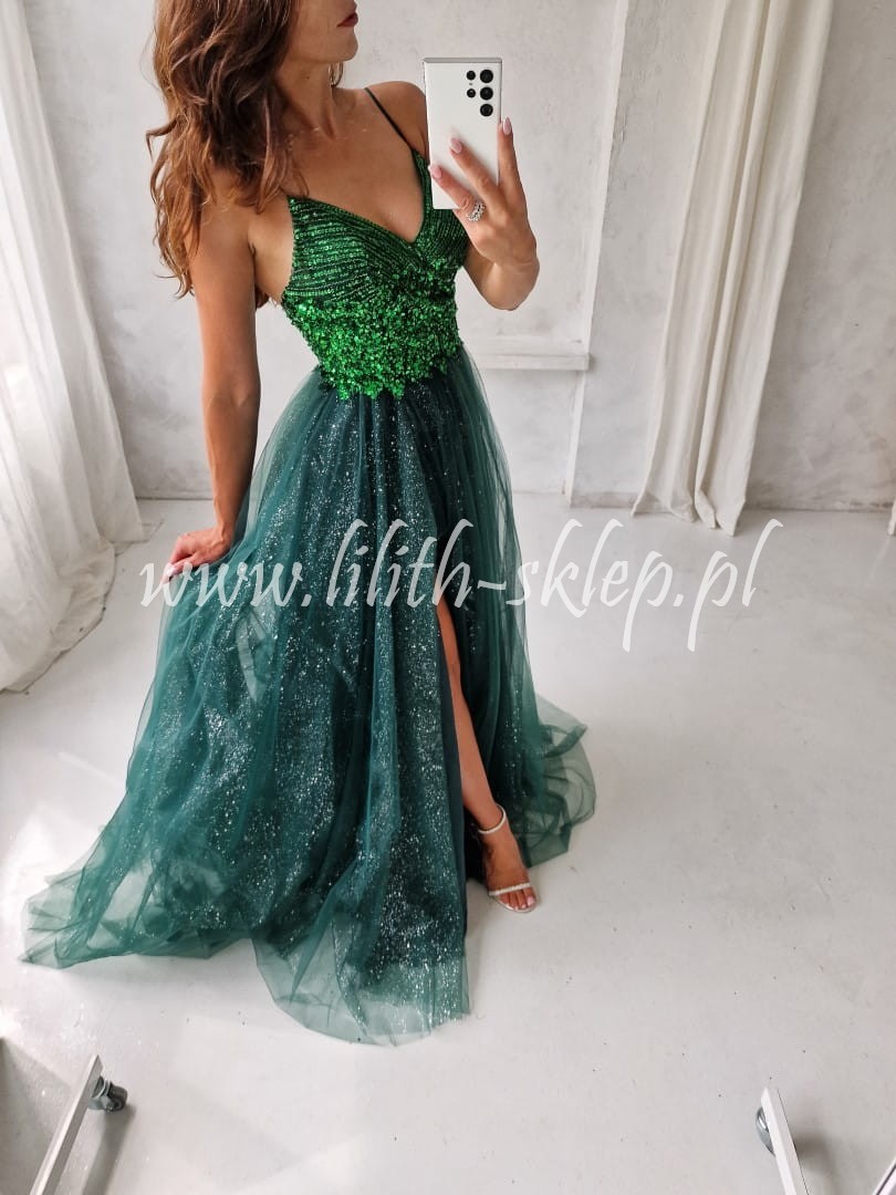 Wyjątkowa sukienka wieczorowa w kolorze butelkowej zieleni. Góra kreacji przyozdobiona mieniącą się biżuterią w postaci koralików oraz cekin w granatowym kolorze. Tył mocno wycięty. Luźny, tiulowy dół dodaje lekkości i świeżości całej stylizacji. Spodnia warstwa tiulu została przyozdobiona mieniącymi się drobinkami srebra, które nadają całości niepowtarzalnego charakteru. Kreacja posiada rozcięcie seksownie ukazujące nogę. W sukience zostały wszyte wkładki, dzięki czemu można nosić ją bez dodatkowej bielizny. Zapinana na kryty zamek, znajdujący się z tyłu sukienki. Idealna propozycja sukienki na wielkie wyjście.